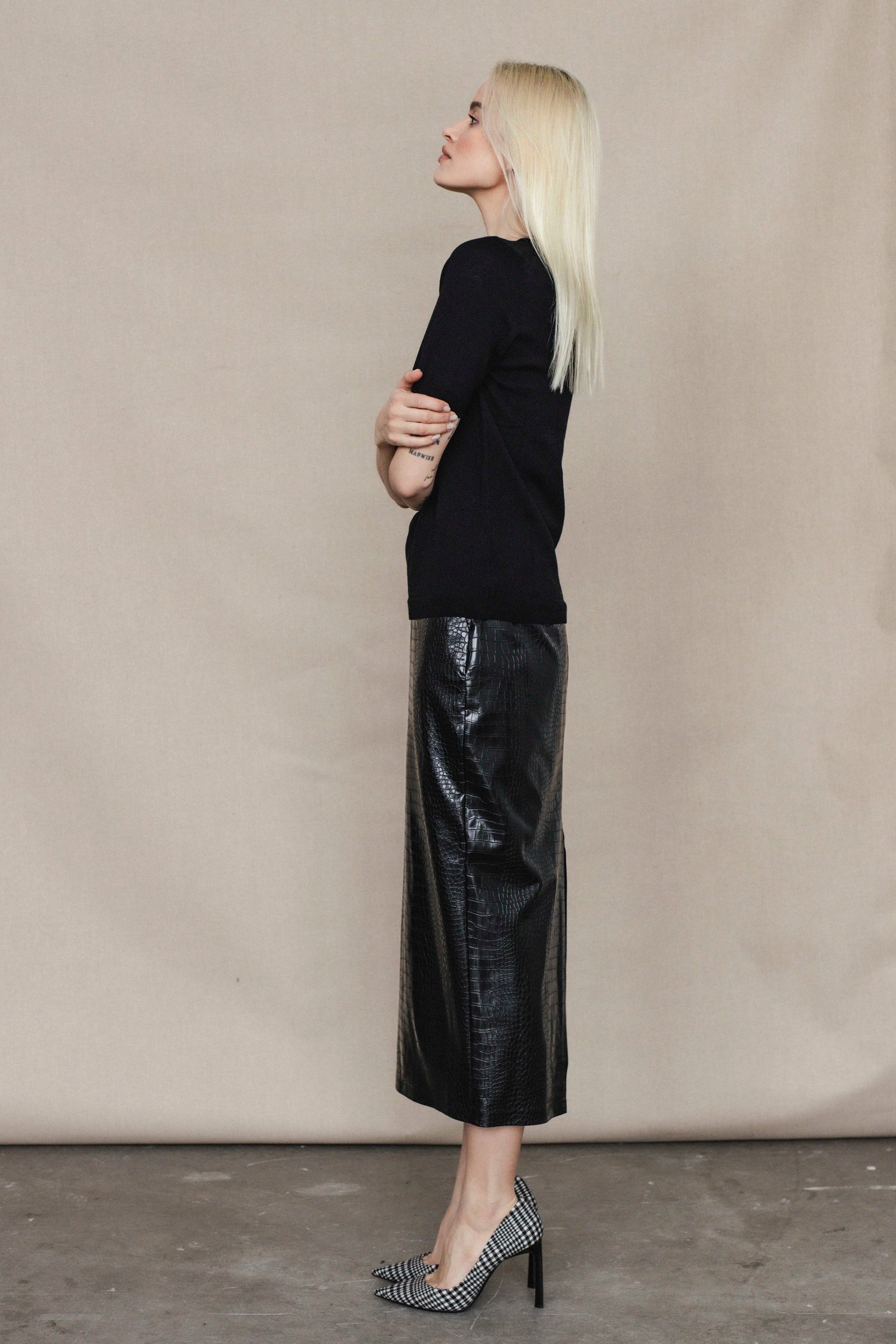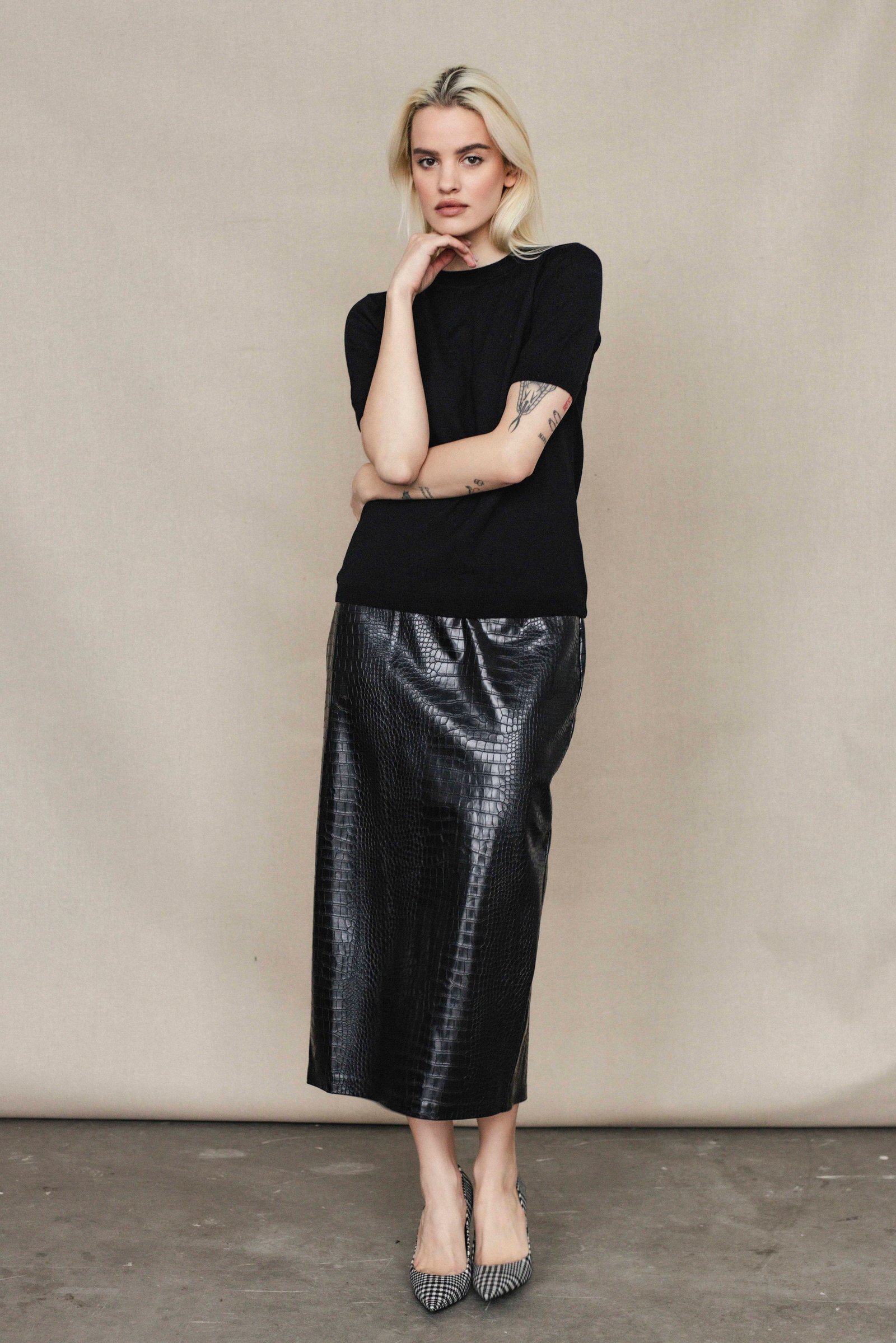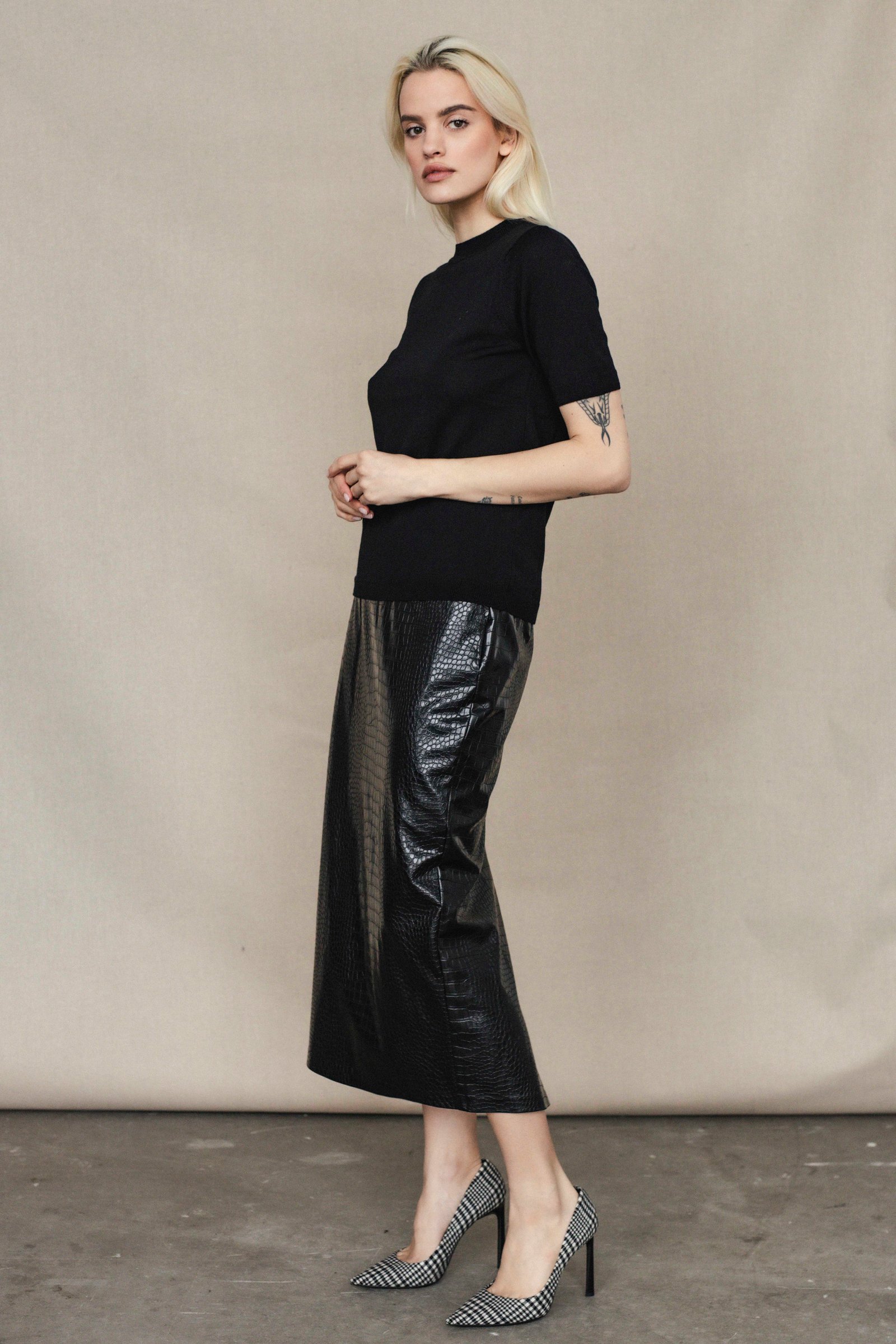 straight fit with back slit, with side pockets, elastic waist and zipper closure, no lining