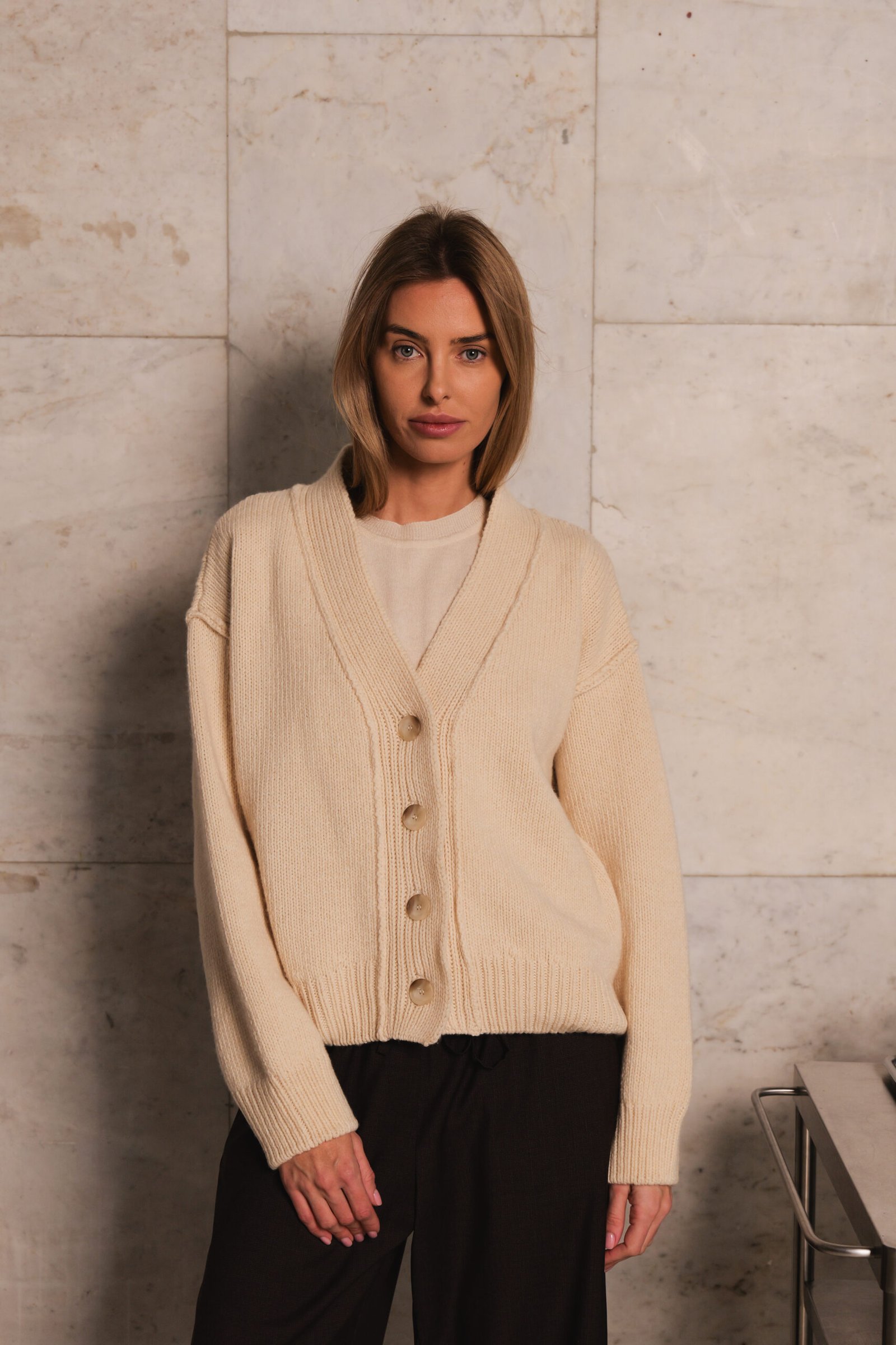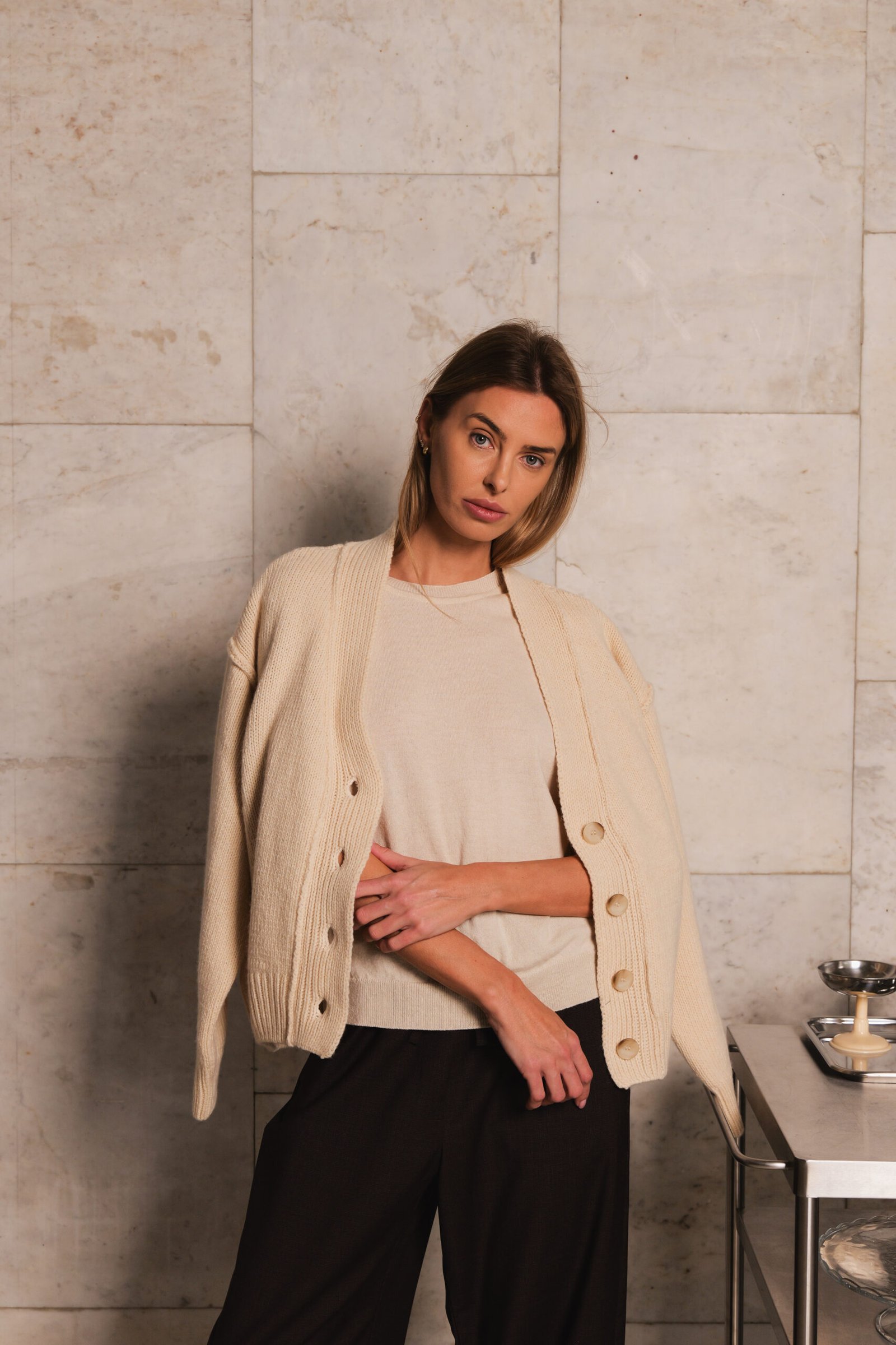 loose fit / long sleeve /above hip length / deep v- neck / button fastening