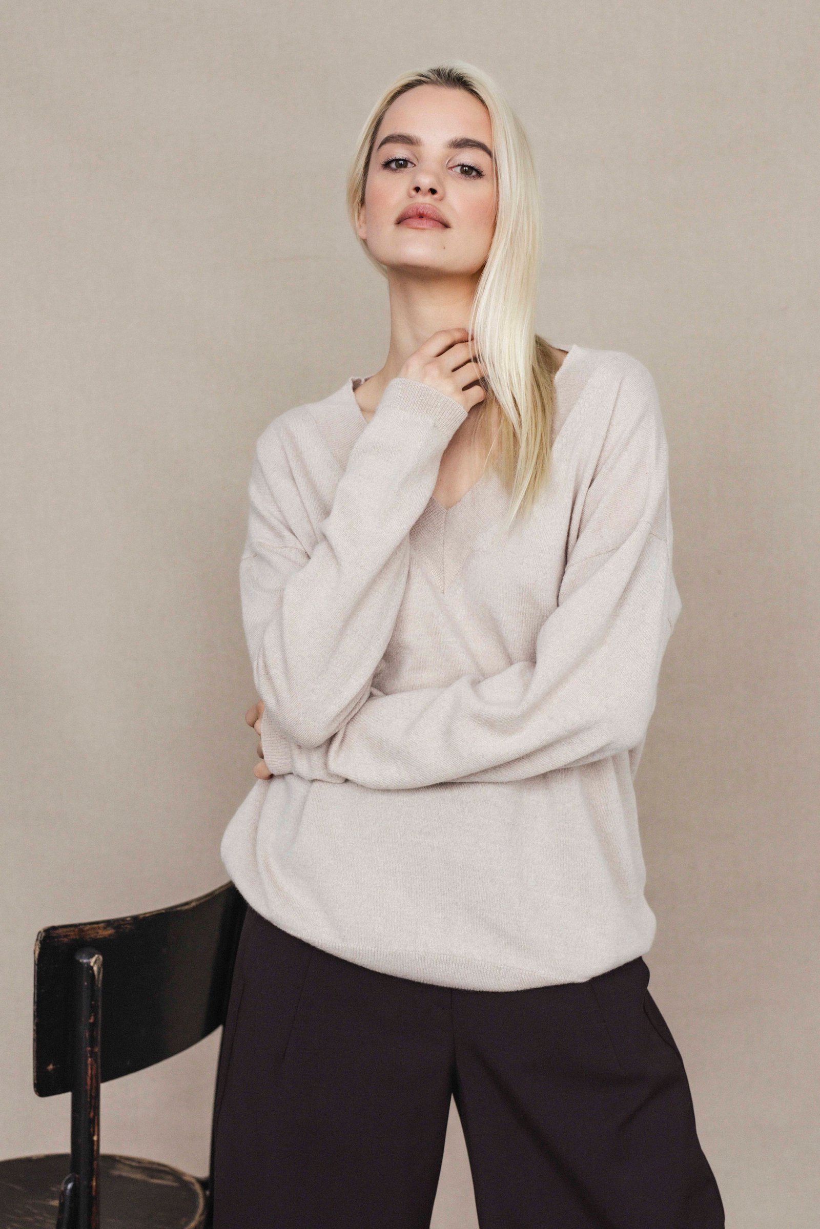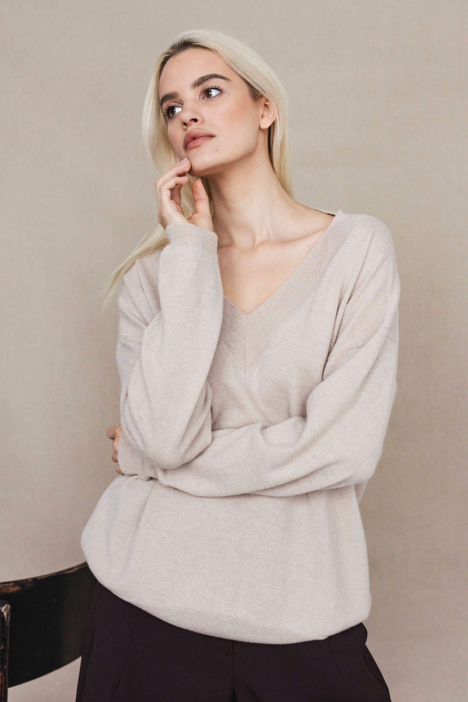 loose oversize fit / long sleeve / hip length / deep v- neck