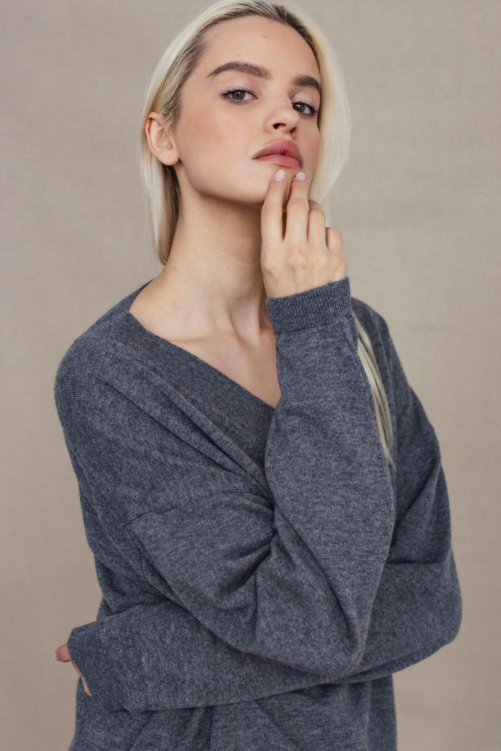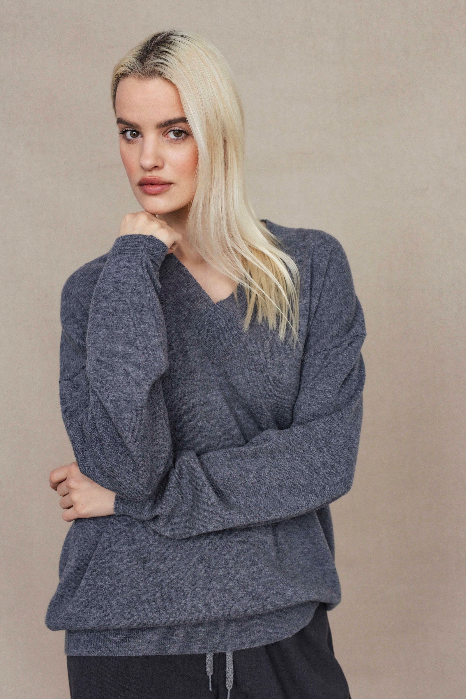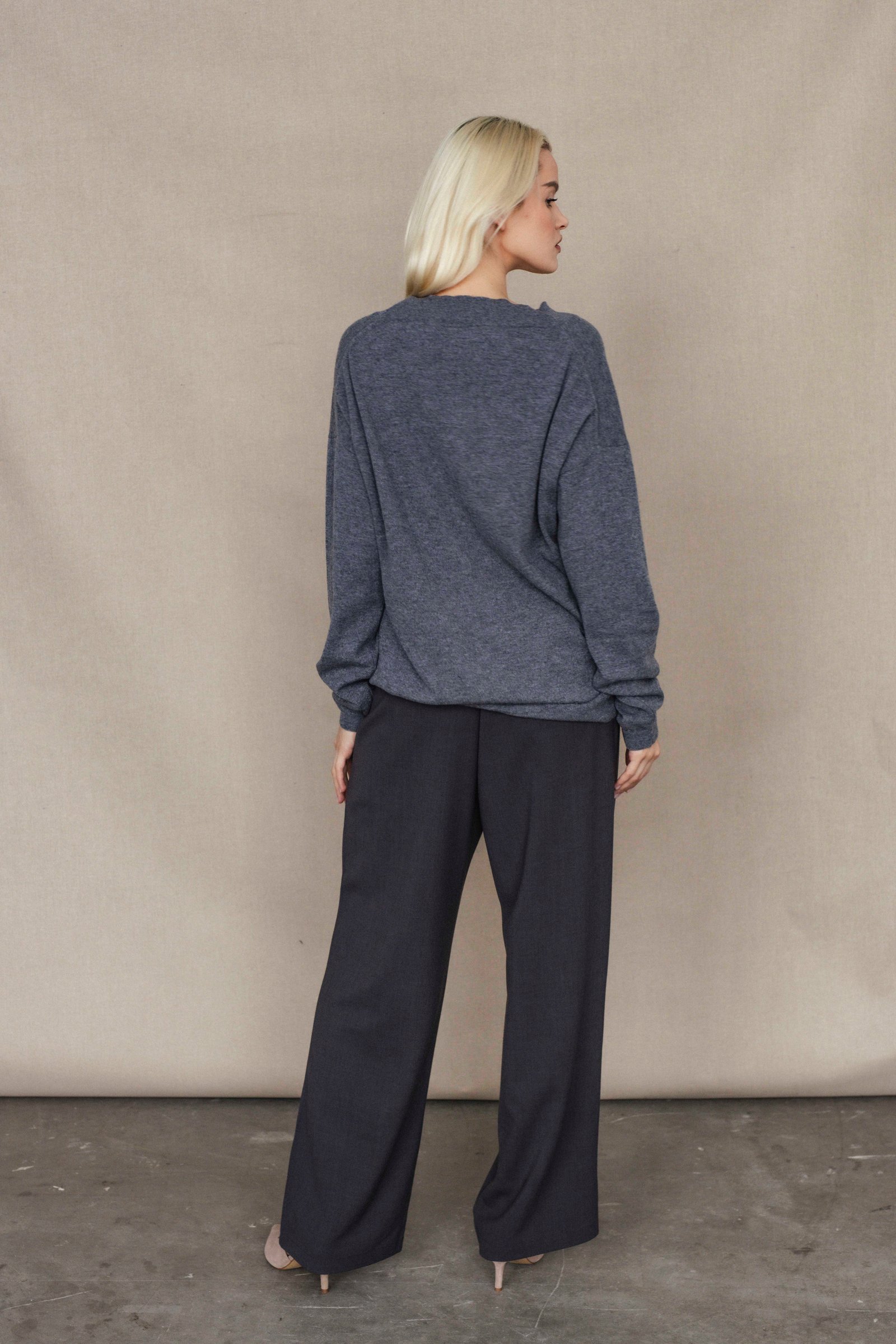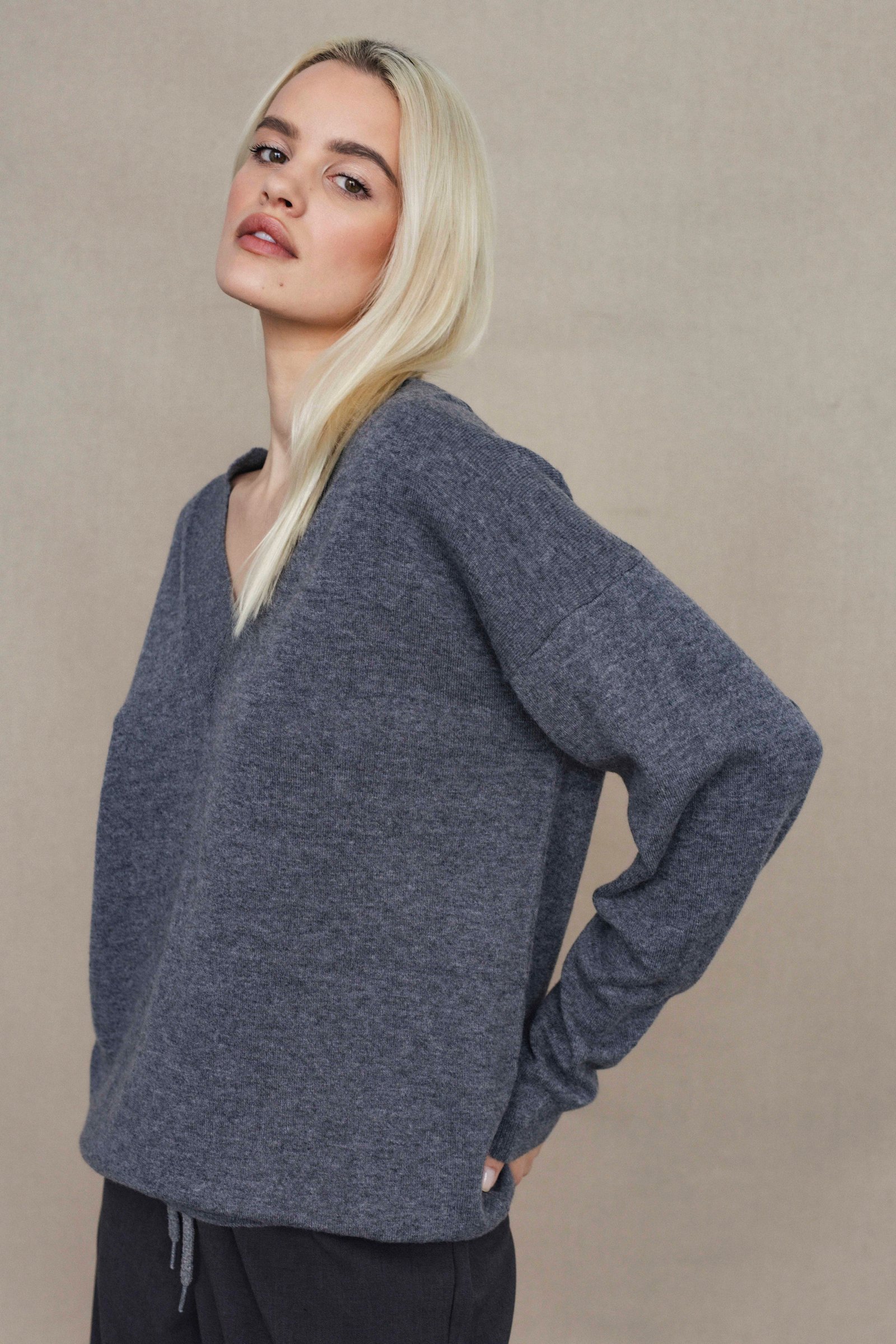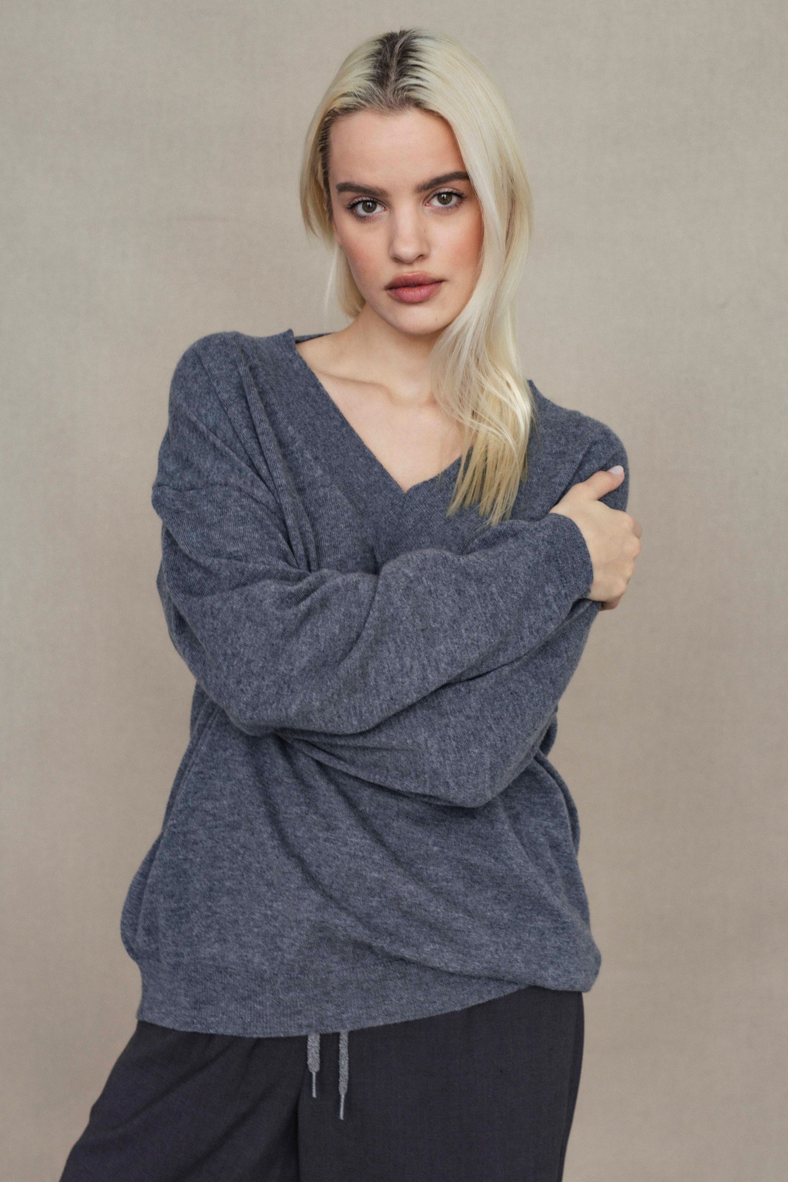 loose oversize fit / long sleeve / hip length / deep v- neck