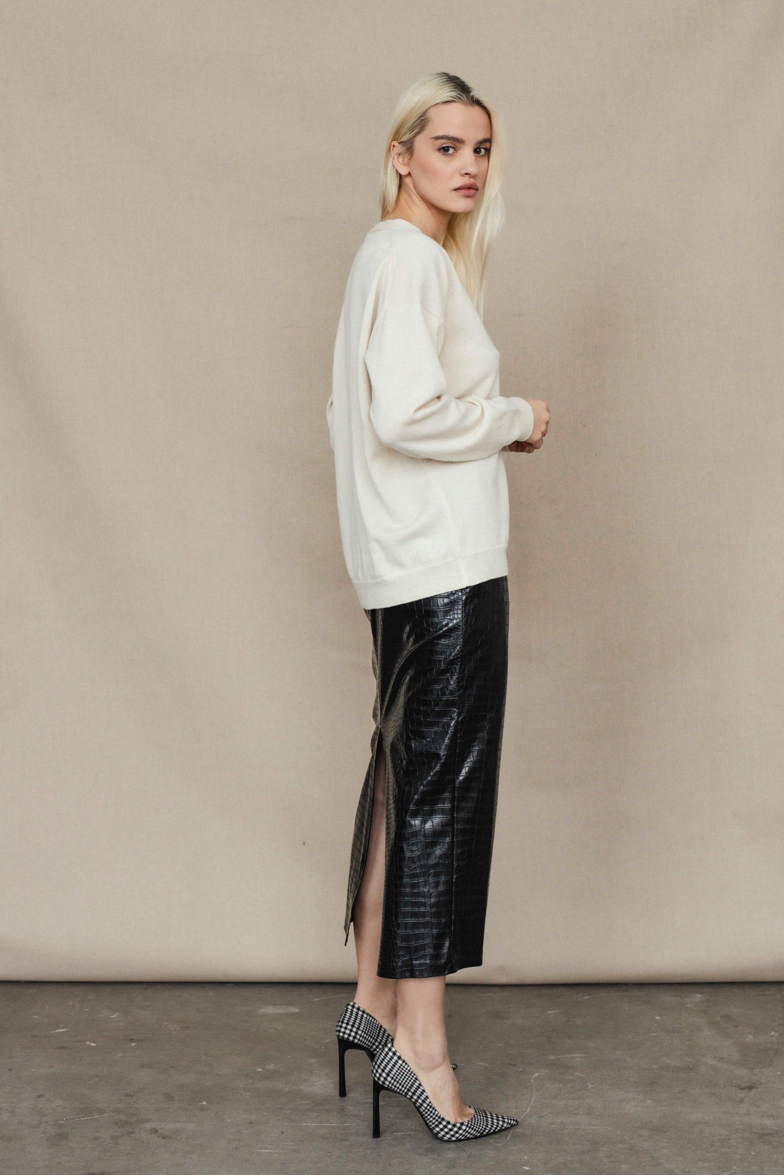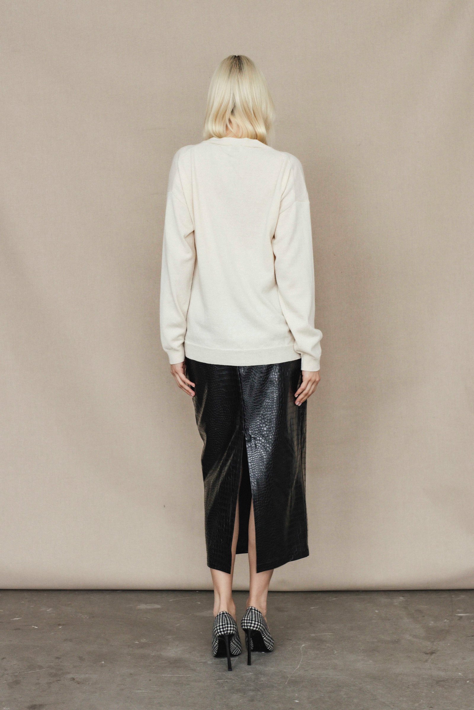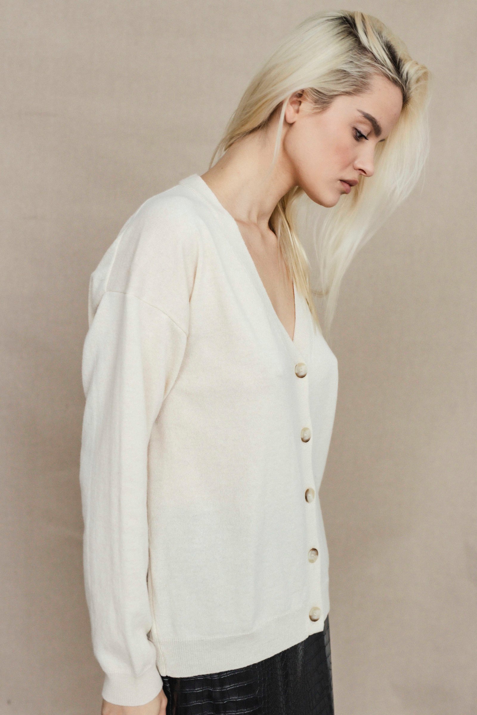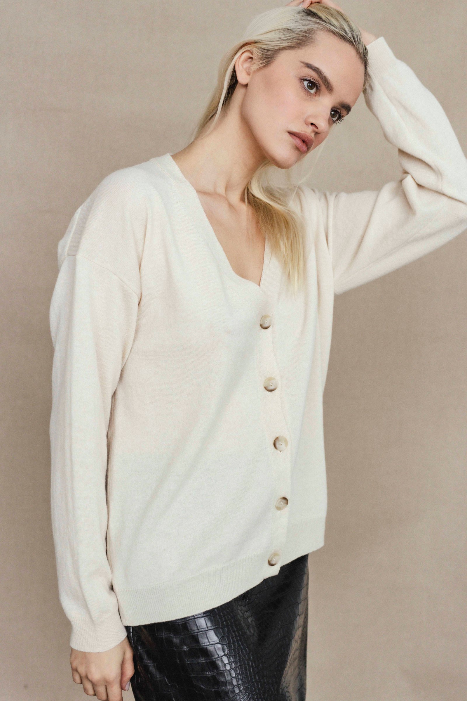 loose oversize fit / long sleeve / hip length / deep v- neck / button fastening
