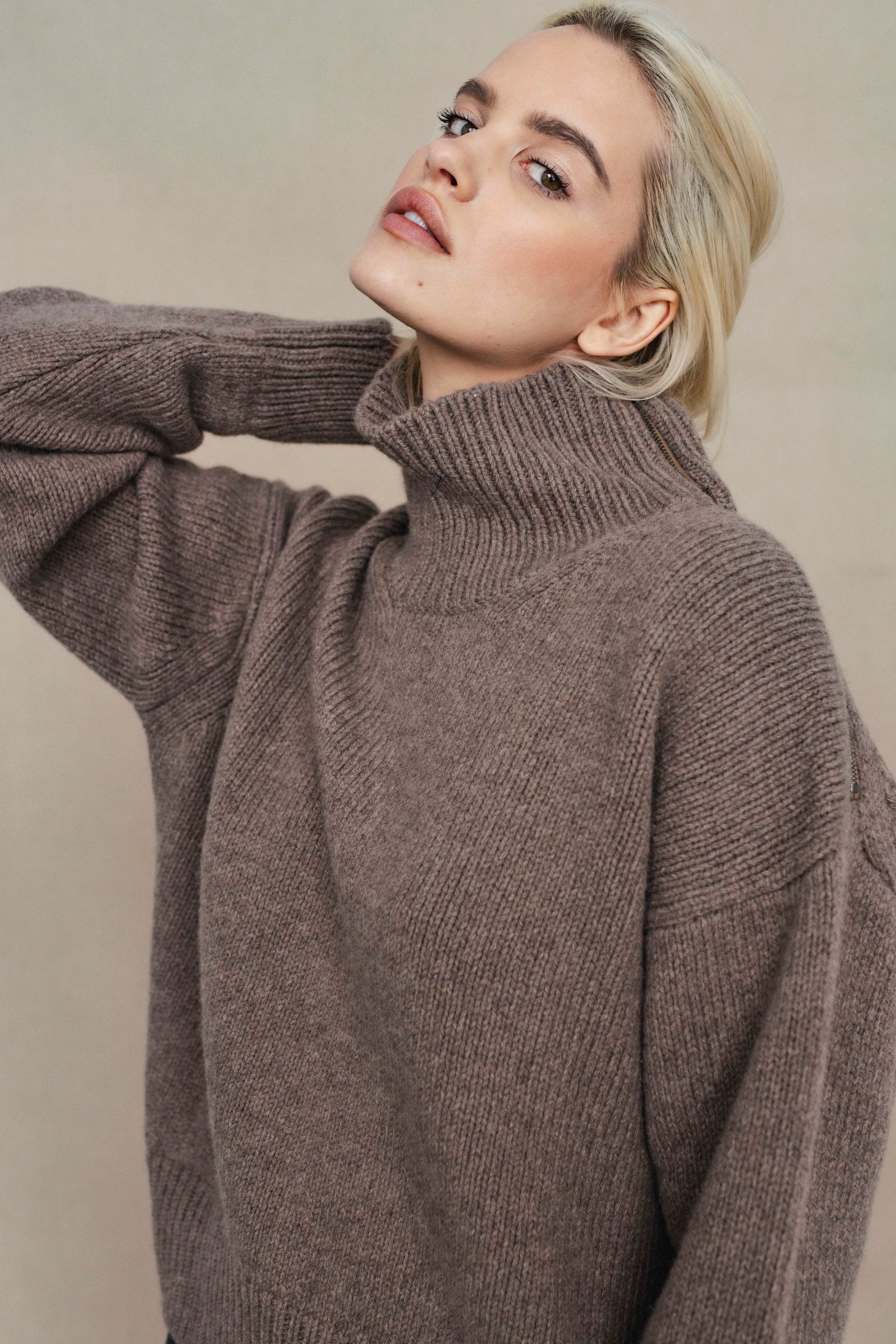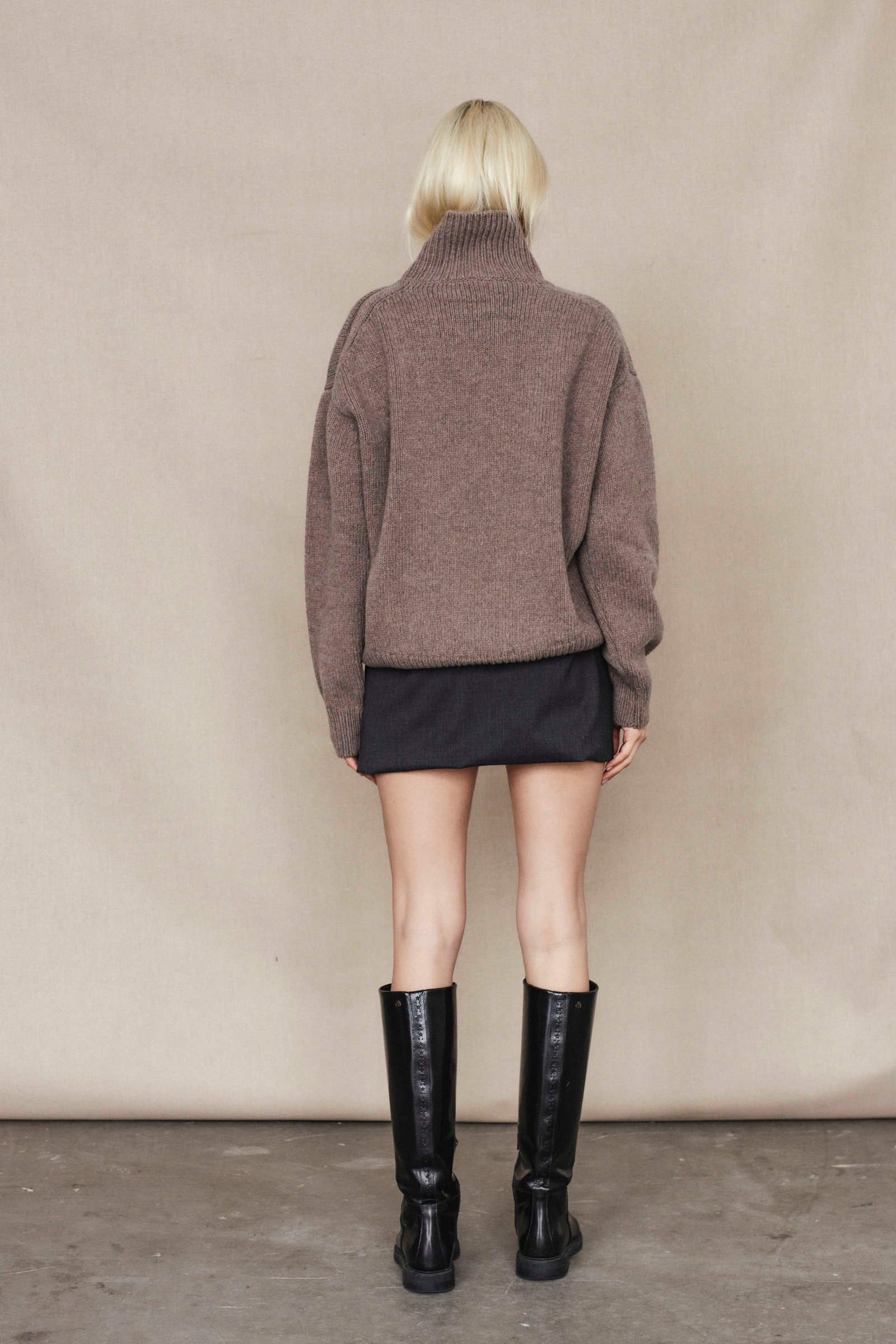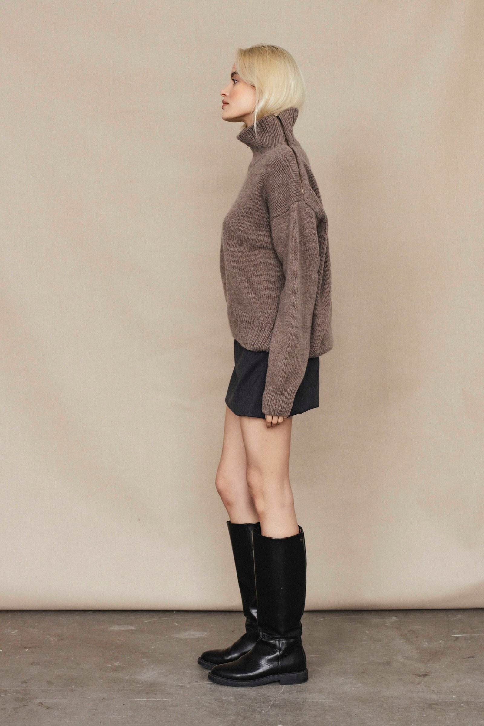 loose fit / long sleeve /above hip length / mock neck / side shoulder zipper closure