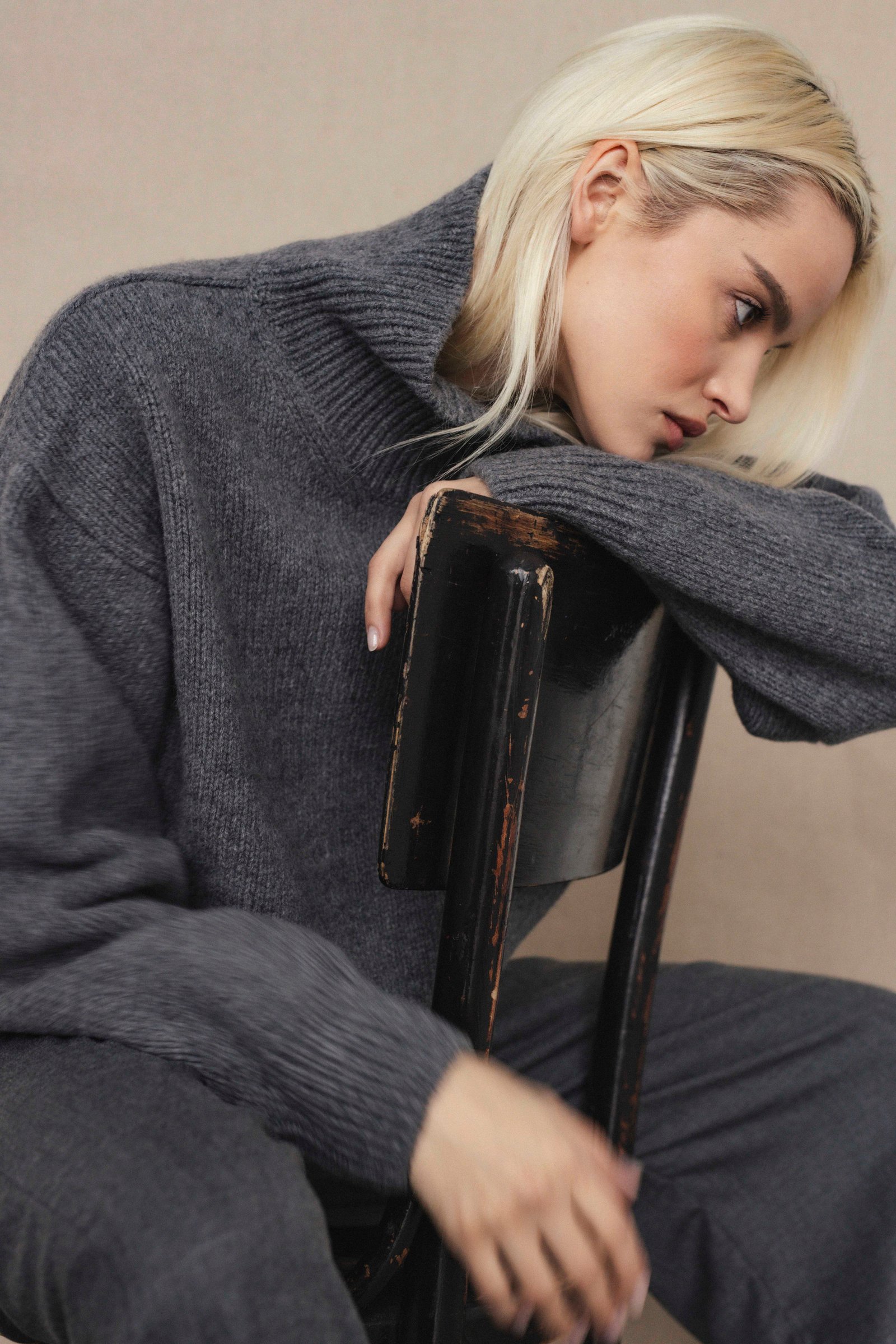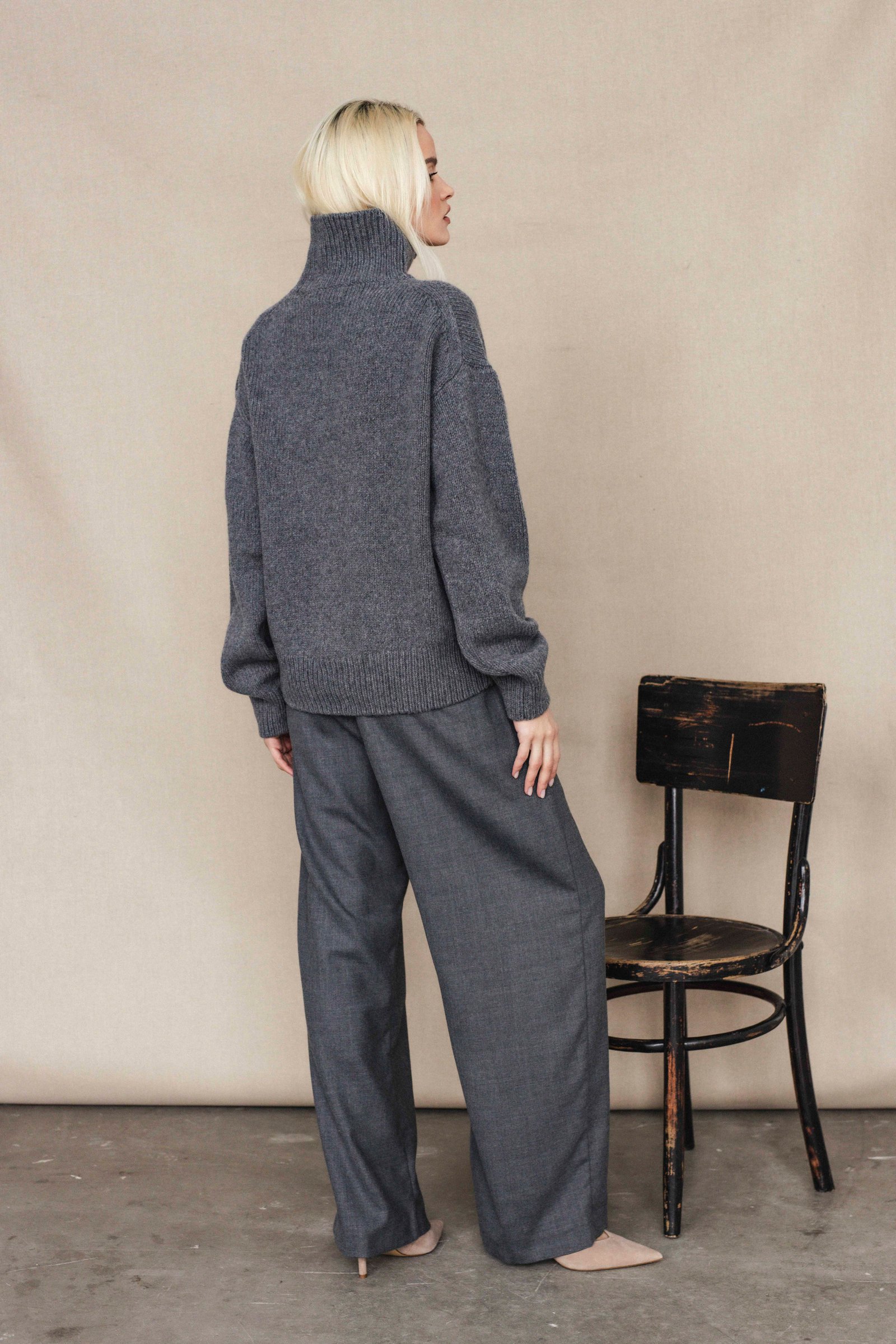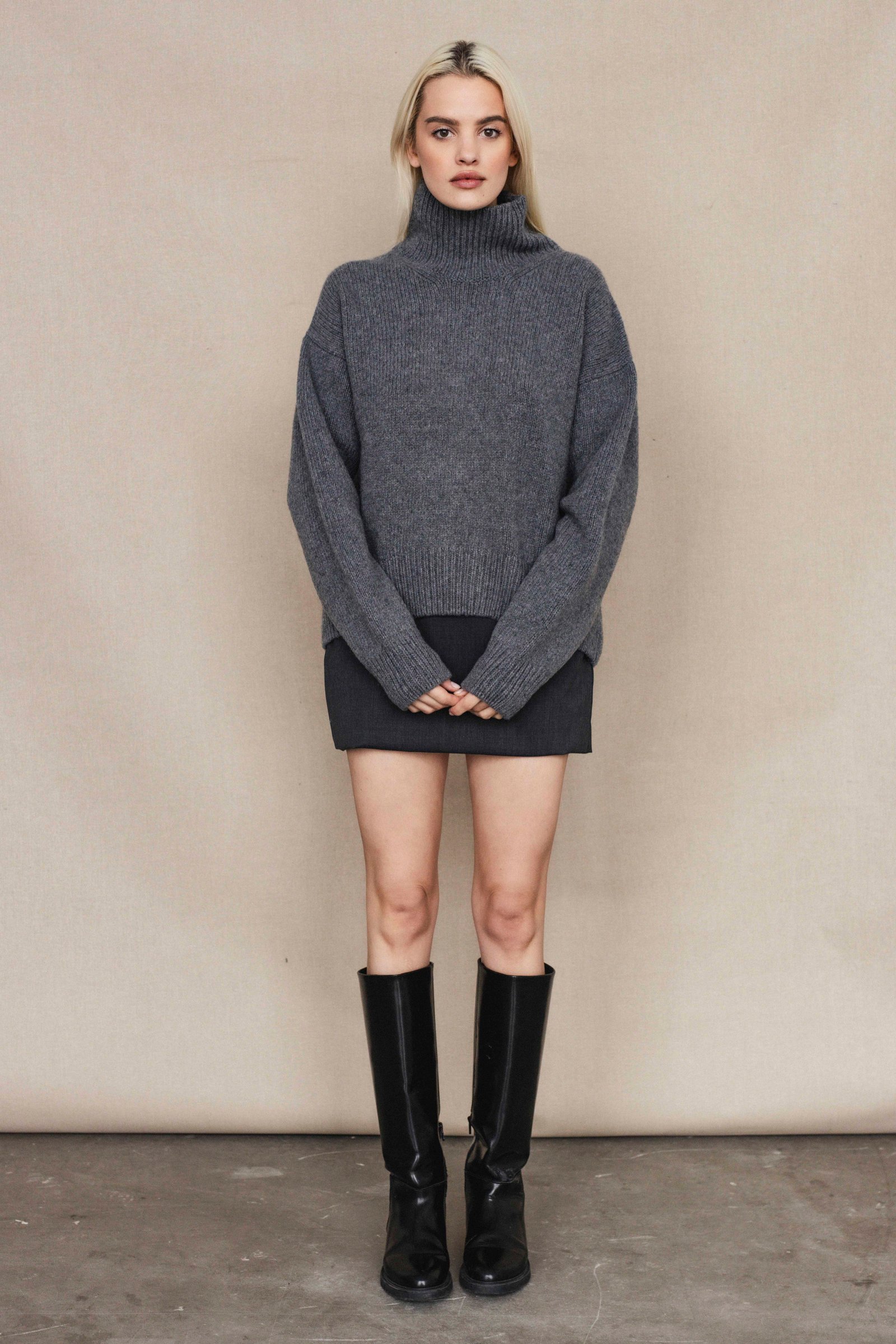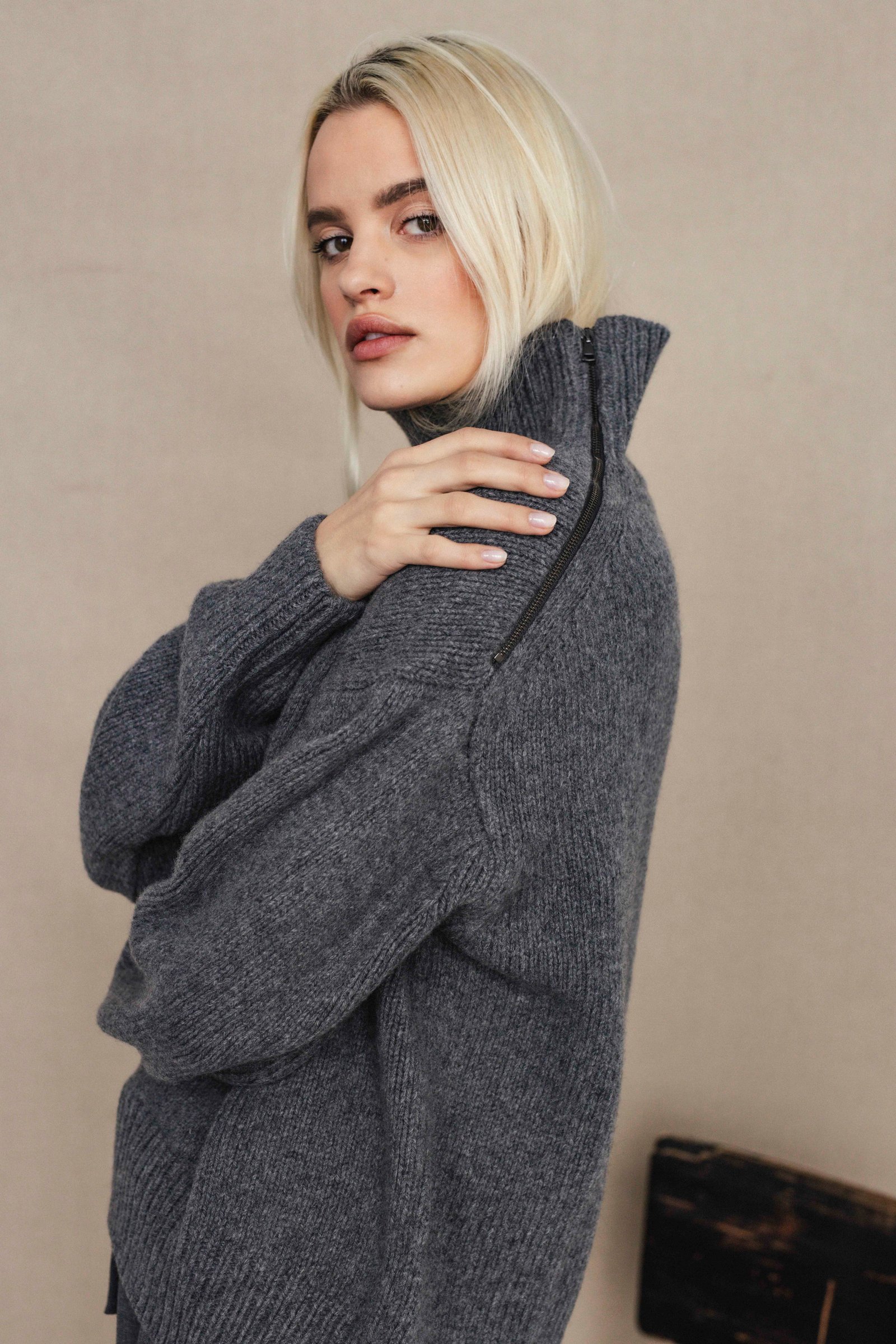loose fit / long sleeve /above hip length / mock neck / side shoulder zipper closure